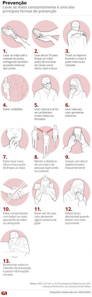 Também é importante evitar tocar na boca nariz ou olhos se estiver em um ambiente público ou em lugares de grandes aglomerações, porque o vírus é transmitido por via aérea e pelo contato com secreções respiratórias. E ainda manter os ambientes limpos e higienizar superfícies, móveis e o celular com produtos desinfetantes.